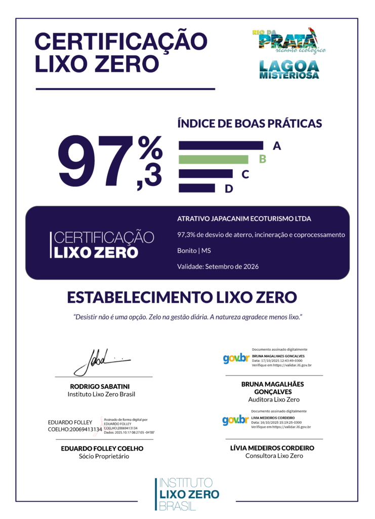 O Recanto Ecológico Rio da Prata e a Lagoa Misteriosa conquistaram a Certificação Lixo Zero, concedida pelo Instituto Lixo Zero Brasil, ao atingirem 97,3% de desvio de resíduos do aterro sanitário. O reconhecimento comprova a eficiência da gestão ambiental dos atrativos e o compromisso do Grupo Rio da Prata com a sustentabilidade e a economia circular.